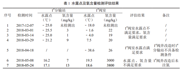 (1)根據(jù)水露點(diǎn)及氧含量檢測分析結(jié)果,管道水露點(diǎn)不滿足規(guī)范要求,且1#閥井改造后管道內(nèi)氧含量不滿足要求。