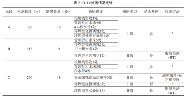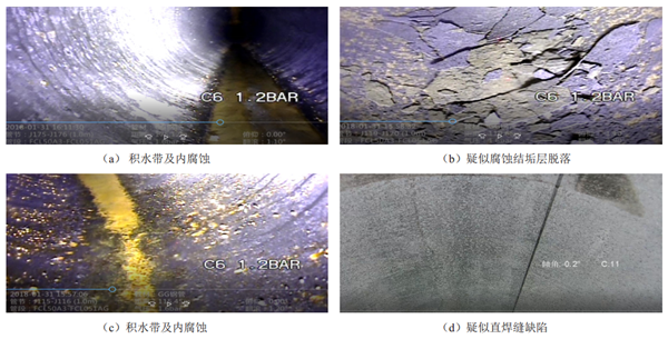 評(píng)估重點(diǎn)為管道施工期焊口焊接質(zhì)量;管道外腐蝕情況;管道內(nèi)腐蝕情況。選取了水露點(diǎn)及氧含量檢測分析、 CCTV檢測、 ECDA、 X光片復(fù)查、無損檢測、超聲測厚、超聲相控陣檢測等綜合檢測及評(píng)估方法。