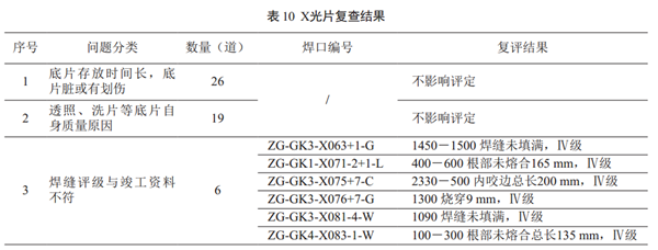 依據(jù)施工期執(zhí)行的SY/T 4109―2005《石油天然氣鋼質(zhì)管道無損檢測》,對施工期焊口X光片進(jìn)行復(fù)查,檢查及評(píng)價(jià)焊口焊接質(zhì)量,具體復(fù)查結(jié)果見表 10。