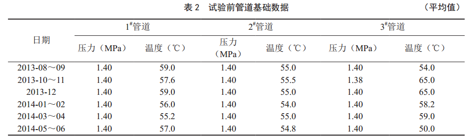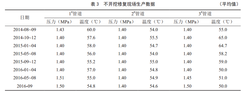 根據(jù)內(nèi)翻襯玻璃鋼軟管修復(fù)技術(shù)原理,完成3條摻水管道不開(kāi)挖修復(fù)施工(圖 4)。經(jīng)運(yùn)行25個(gè)多月,管道日常生產(chǎn)運(yùn)行平穩(wěn),平均摻水壓力保持在0.1 MPa正常波動(dòng),從現(xiàn)場(chǎng)實(shí)際生產(chǎn)數(shù)據(jù)可以看出不開(kāi)挖修復(fù)內(nèi)襯軟管能夠滿(mǎn)足油田生產(chǎn)需求(表 3)。