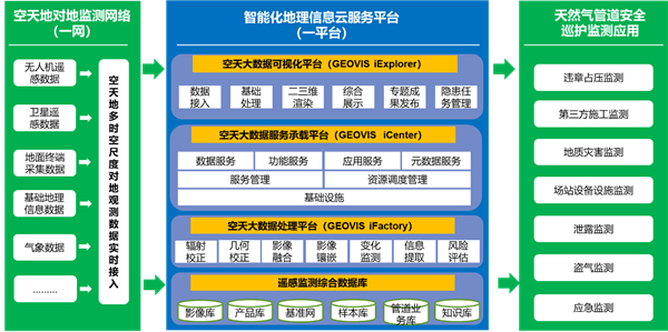 空天地對(duì)地監(jiān)測(cè)網(wǎng)絡(luò)實(shí)現(xiàn)多源、多時(shí)相、多尺度觀測(cè)數(shù)據(jù)的接入,主要包括高分辨率衛(wèi)星遙感影像、無(wú)人機(jī)、地面巡邏車加終端采集系統(tǒng)、氣象聯(lián)動(dòng)監(jiān)測(cè)等方式對(duì)管道本體信息、沿線環(huán)境、氣象等信息的接入。