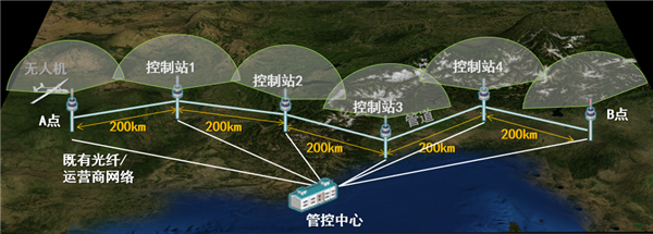 通過(guò)建立地面測(cè)控站,管控中心通過(guò)測(cè)控站組網(wǎng)對(duì)無(wú)人機(jī)進(jìn)行遠(yuǎn)程控制。按飛行計(jì)劃獲取沿線的影像及視頻數(shù)據(jù),通過(guò)一體化測(cè)控網(wǎng)絡(luò)匯集傳遞到管控中心。無(wú)人機(jī)測(cè)控網(wǎng)絡(luò)示意圖如圖 3所示。