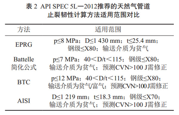 API SPEC 5L―2012《管線鋼管規(guī)范》推薦了4種鋼管延性斷裂止裂韌性的計算方法,包括EPRG準則、 Battelle簡化公式、 BTC方法以及AISI方法。對比4種方法的適用范圍(表 2)可見,對于設(shè)計壓力12 MPa、管徑1 422 mm X80的天然氣管道,適宜采用BTC模型并引入修正系數(shù)的方法來計算止裂韌性。