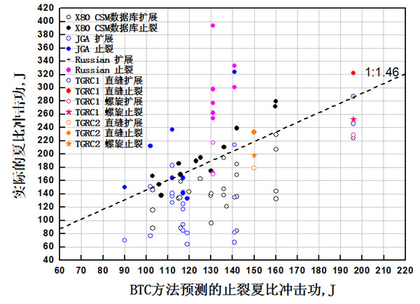 將BTC方法應用于中俄東線氣質(zhì)組分(表 3),計算溫度取0 ℃,計算結(jié)果(圖 7)表明,中俄東線氣質(zhì)組分存在明顯的減壓波平臺,止裂韌性CVN計算值為167.97 J。由于BTC方法止裂韌性計算值超過100 J,因此必須進行修正。其中修正系數(shù)的確定來源于X80全尺寸爆破試驗數(shù)據(jù)庫。目前國際上通用的全尺寸爆破試驗數(shù)據(jù)庫如圖 8所示[14,15],由此確定的中俄東線1 422 mm X80管道止裂韌性修正方法為TGRC2,修正系數(shù)為1.46。經(jīng)過1.46倍的線性修正,將止裂韌性指標確定為245 J。需要指出的是,計算并修正后得到的245 J是止裂概率為100%的單根鋼管的韌性要求值。參考美國DOT 49 CFR Part 192的規(guī)定,裂紋能在5~8根鋼管止裂,對應的止裂概率達到95%和99%即可。按照這一原則,止裂韌性指標確定為245 J應該是偏于保守和安全的。