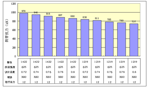 采用Driver和Playdon提出的管道刺穿抗力的半經(jīng)驗估算模型[16],計算了不同管徑、不同設(shè)計系數(shù)下X80管道的刺穿抗力,結(jié)果如圖 9所示。可以看出,在相同操作壓力和設(shè)計系數(shù)下, OD 1 422 mmX80管道比OD 1 219 mm X80管道的刺穿抗力要大,主要因為管道壁厚的增加。以0.72的設(shè)計系數(shù)為例,OD 1 422 mm X80與OD 1 219 mm X80管道相比,刺穿抗力提高約16.7%。在操作壓力、外徑相同的條件下,設(shè)計系數(shù)提高,管道刺穿抗力降低,這是因為,設(shè)計系數(shù)的提高將降低對管道壁厚的需求。