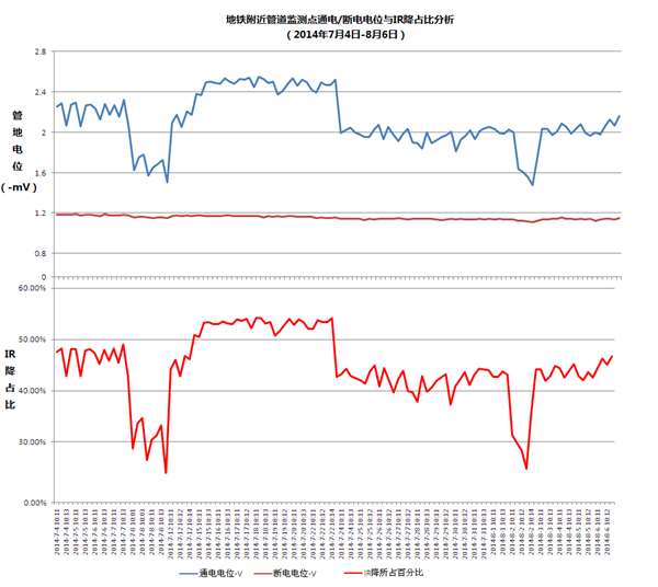 在日常測試和評價陰極保護(hù)有效性過程中,應(yīng)充分理解通電電位、 IR降和斷電電位之間的關(guān)系。由于通電電位測試相對容易便捷,在現(xiàn)場測試過程中部分工程人員往往利用測試樁處某次測得的通電電位、IR降和斷電電位,將IR降部分作為一個固定值或者通電電位的線性百分比來計算保護(hù)電位。實(shí)際上, IR降占比是隨通電電位變化的,隨著季節(jié)性土壤電阻率變化, IR降占比也會變化,應(yīng)充分理解IR降和管道極化的意義及與通電電位的關(guān)系,避免錯誤判斷陰極保護(hù)的有效性。