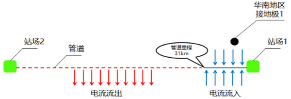高壓直流輸電工程有兩個(gè)接地極,其中一個(gè)流入電流,另外一個(gè)流出電流。在接地極流入電流時(shí),靠近接地極管道電位正向偏移,遠(yuǎn)離接地極管道電位負(fù)向偏移;在接地極流出電流時(shí),靠近接地極管道電位負(fù)向偏移,遠(yuǎn)離接地極管道電位正向偏移。在接地極附近的天然氣管道上設(shè)置多個(gè)電位監(jiān)測(cè)點(diǎn),分別在離接地極最近位置和遠(yuǎn)離接地極位置同時(shí)設(shè)置,對(duì)管道電位進(jìn)行連續(xù)不間斷監(jiān)測(cè)。通過(guò)同一條管道多個(gè)位置的通電電位同時(shí)發(fā)生正向或者負(fù)向偏移,判斷管道是否受到接地極的干擾。