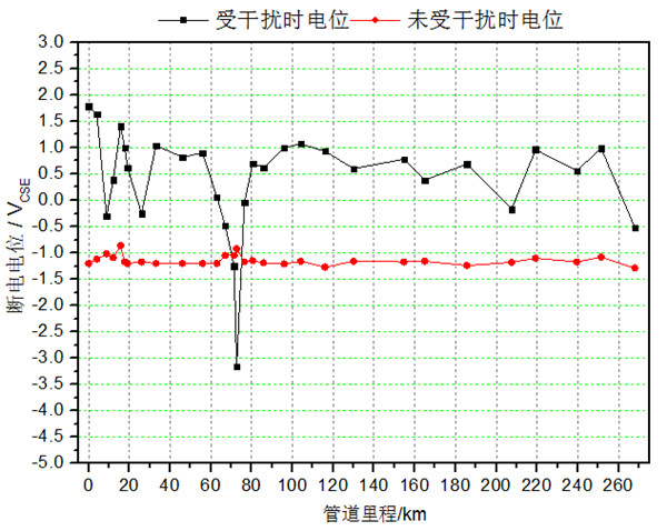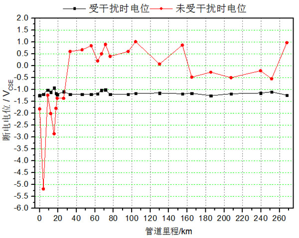 圖 6 管道10受華南地區(qū)接地極1干擾時(shí)通/斷電電位分布圖