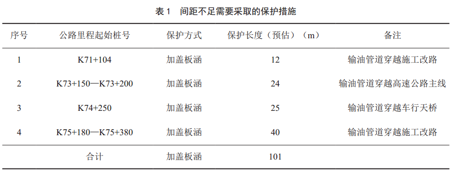 經(jīng)現(xiàn)場(chǎng)踏勘,并依據(jù)佛開高速擴(kuò)建項(xiàng)目涉石油管道統(tǒng)計(jì)表進(jìn)行現(xiàn)場(chǎng)排查后,輸油管道與高速公路相對(duì)位置不足需要采取的保護(hù)措施見表 1。