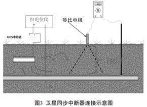 在恒電位儀陽極或陰極串入衛(wèi)星同步中斷器, 設置通斷周期, 在測試樁處通過使用萬用表與便攜式參比電極進行測試, 具體連接見圖3。通常采用“通12s, 斷3s”的通斷周期, 在一個通斷周期15s內, 讀取兩個參數即通電電位和斷電電位, 在通12s內萬用表讀數基本穩(wěn)定在一個數值即得到通電電位, 在斷3s內發(fā)生斷電瞬間萬用表顯示第一個數值即斷電電位。 通過分析斷電電位是否達到-850mv標準, 評價管道是否處于陰極保護系統(tǒng)有效保護。