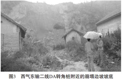 圖4為西氣東輸管道3232km+700m里程處的邊坡坍滑體, 管道沿60~70m高的山坡鋪設(shè), 埋深2.4m, 回填土為當(dāng)?shù)氐狞S土狀土, 土質(zhì)松散,雨水浸泡后產(chǎn)生坍滑, 將坡腳擋墻擠毀并越頂堆積于前緣, 致使管道外露并形成危害。