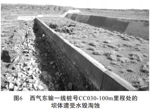西氣東輸管道在多處河道、 沖溝中以埋入方式通過(guò), 洪水沖毀保護(hù)管道的建筑物的情況每年都有發(fā)生。 圖6為管線在溢流壩體上游穿越通山溝河, 管道埋入河道2~3m, 河道寬80~90 m, 管線下游設(shè)置兩道溢流壩。 目前第二級(jí)溢流壩由于水毀已形成較大面積的塌陷, 壩體嚴(yán)重受損, 壩前鉛絲石籠已毀壞, 失去對(duì)洪水的消能作用。 若不采取修復(fù)加固工程, 則對(duì)壩體上游的管線安全產(chǎn)生危害作用。