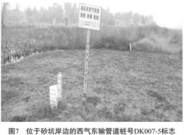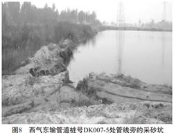 人為活動(dòng)主要是指亂采、 亂挖, 灌溉水下滲、 爆破震動(dòng)等, 對(duì)管道安全造成危害。 圖7、 圖8為采砂挖砂后形成的地下水匯聚湖塘, 岸邊距管線近10m, 采砂活動(dòng)一直在進(jìn)行, 岸邊的漸進(jìn)坍塌對(duì)管線存在隱患。