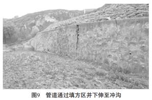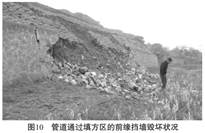 西氣東輸二線管道通過(guò)20000m3的棄土填方區(qū), 管道埋入填土內(nèi)4m并下伸到?jīng)_溝, 填土前緣設(shè)置擋墻, 如圖10所示。