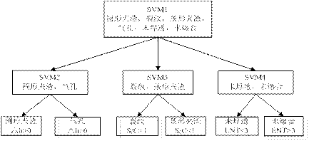 分類器構(gòu)造應(yīng)優(yōu)先采用類別差異性排除法,即在整體結(jié)構(gòu)中,先將相似量作為一類,然后根據(jù)相似量之間的細(xì)微變化,再通過(guò)模型算法進(jìn)行區(qū)分。這種分類在分類準(zhǔn)確率和平衡準(zhǔn)確率上都有極高的效率。本文構(gòu)造了6種缺陷,裂紋、圓形夾渣、條形夾渣、氣孔、未焊透、未熔合等典型缺陷SVM多類分類器(圖4)。