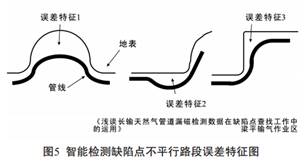 因為地面高低起伏不是規(guī)則的幾何圖形, 不是絕對的矩形或絕對的圓, 所以要通過精確計算是很有難度的, 通常現(xiàn)場測量對誤差的把握靠的是現(xiàn)場測量人員的經(jīng)驗和判斷。 整個測量過程必須應(yīng)用探管儀對管道埋深進行全程監(jiān)控, 遇見如圖5中的誤差特征或其他特征時, 測量人員應(yīng)合理運用幾何知識對測量誤差進行加減修正。 如果現(xiàn)場計算判斷失誤量累計過多, 誤差就會超出控制范圍。