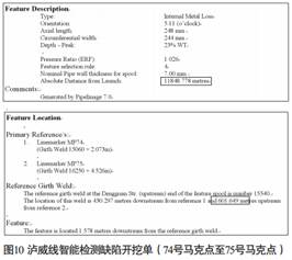 筆者以2008年8月的屏忠線檢測數(shù)據(jù)生成的一張缺陷開挖單舉例做簡單說明。 見圖1, 上游A084號馬克點在6680號環(huán)焊縫下游2.4米處, 下游A079號馬克點在7630號環(huán)焊縫下游6.1米處, 兩點間距為748.2米(495.8米+252.4米) , 上游點距離缺陷點較近的7250焊口495.8米, 下有點距離缺陷點較近的7250焊口252.4米。 那我們使用皮尺從下游點往上游點測量前進252.4米, 就是7250焊縫位置, Feature中的“0.0metres”表示缺陷與7250焊縫的距離是0米, 這說明缺陷就在焊縫上。
