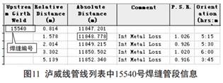 但還有更簡單的方法。 同樣以圖8所示缺陷為例, 通過PII橫向功能列表里面中的“ Pipeline”按鍵可打開管線列表(注: 管線列表主要記錄了每段管節(jié)的長度, 焊縫里程、 彎頭度數(shù)等信息) 。