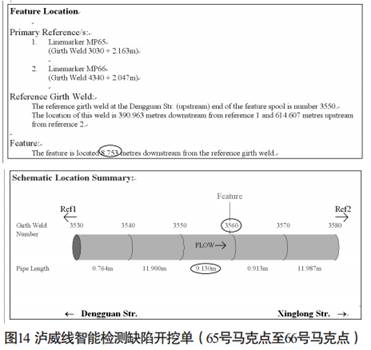 如圖 1 4, 缺陷點距上下游馬克點分別是390.963米和614.607米。 缺陷點位于3560號焊縫周邊。