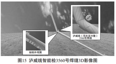 如圖15, 我們通過該管道的3D影像明顯的看到了焊縫3560處的彎頭。 經(jīng)驗豐富、 對管道現(xiàn)場熟悉的管護工可以不進行任何測量就直接找到位于山坡上的彎頭。 找到鏈接彎頭的3560號焊縫后, 結(jié)合圖14, 從焊縫朝上游準(zhǔn)確測量焊縫0.377米(9.13-8.753) 就是缺陷點。