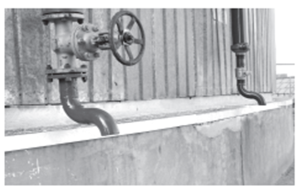 (3)在消防管線立管末端上安裝一個(gè)彎頭, 使消防管線內(nèi)的水排放在散水外邊,防止水溢流在罐體散水上,確保散水水泥板的完好(圖8)。