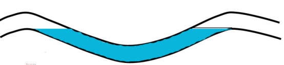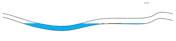 該原油管道首站出站50 322.605 m和50 890.035 m 2處缺陷相距568 m,處在同一工程段。50 322.605 m處內(nèi)腐蝕分布情況與管道局部走向如圖3所示,50 890.035 m處內(nèi)腐蝕分布情況與管道局部走向如圖4所示。根據(jù)內(nèi)腐蝕分布情況推斷,此2處的連續(xù)管節(jié)可能曾存在大量積水,積水應(yīng)來自于建設(shè)期試壓水。查閱建設(shè)施工資料,該管段于2011年5月左右試壓,于2013年1月投產(chǎn),由此推斷積水在該處存在了1年7個(gè)月,內(nèi)腐蝕應(yīng)該是在這段時(shí)間內(nèi)逐漸發(fā)展的。
