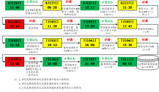 從C站發(fā)送的第四個清管器為兩支撐六直板清管器,于6月23日11:40發(fā)出,排量820方/小時,壓力4.4MPa,溫度15℃;7月17日08:55進(jìn)鄭州站,清管器推出雜質(zhì)173公斤(主要為粗砂),過濾器累計(jì)清理4次共清除160公斤雜質(zhì)。具體的時間行進(jìn)表見下圖2。