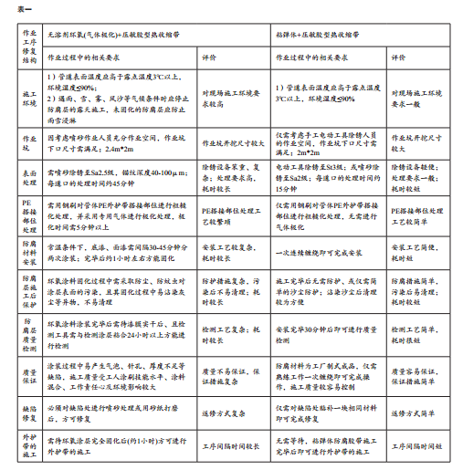 2、“無溶劑環(huán)氧涂料+壓敏膠型熱收縮帶”結(jié)構(gòu)現(xiàn)場施工工藝較為復(fù)雜,對(duì)管體表面處理要求較高,表面處理設(shè)備笨重,防腐層涂裝受外界環(huán)境及工人技能影響較大,工效較低。使用2年后防腐層開挖檢測,補(bǔ)口防腐層性能穩(wěn)定,粘結(jié)強(qiáng)度值達(dá)到了預(yù)定技術(shù)指標(biāo)的要求,但涂層與管體 PE的破壞形式為100%界面剝離,氣體極化處理的實(shí)際效果、環(huán)氧材料的吸水性是否會(huì)導(dǎo)致粘結(jié)強(qiáng)度降低至不可接受值以及涂層劣化速度等,還需后續(xù)進(jìn)行開挖驗(yàn)證。