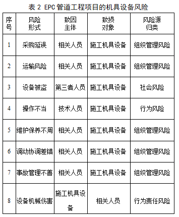 EPC管道工程項(xiàng)目作業(yè)環(huán)節(jié)要使用大量施工機(jī)具、設(shè)備,其在采購(gòu)、進(jìn)出場(chǎng)、使用、調(diào)動(dòng)、維護(hù)保養(yǎng)、事故管理等流程中,由于采購(gòu)延誤,使用、維護(hù)保養(yǎng)不當(dāng),調(diào)動(dòng)欠妥,事故管理不善等原因而存在大量風(fēng)險(xiǎn),如表2所示。