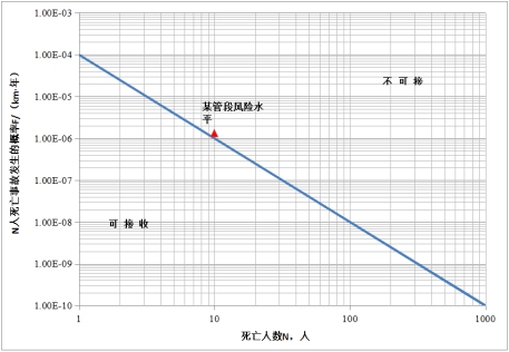 采用已有模型,計(jì)算得出個(gè)體風(fēng)險(xiǎn)為4.85E-05,處于個(gè)體風(fēng)險(xiǎn)可接受區(qū);將計(jì)算所得的死亡人數(shù)和事故發(fā)生概率通過(guò)F-N曲線進(jìn)行風(fēng)險(xiǎn)評(píng)價(jià)。由圖10可見(jiàn),評(píng)價(jià)管段的社會(huì)風(fēng)險(xiǎn)位于F-N曲線的不可接受區(qū),說(shuō)明該管段所處地區(qū)等級(jí)升級(jí)后,社會(huì)風(fēng)險(xiǎn)水平略高于標(biāo)準(zhǔn)規(guī)定,需要采取相應(yīng)的風(fēng)險(xiǎn)減緩措施。