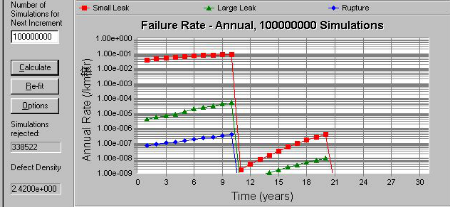 腐蝕缺陷的尺寸是隨時(shí)間增長(zhǎng)的,腐蝕失效概率與時(shí)間具有相關(guān)性;第三方設(shè)備撞擊造成的失效概率與時(shí)間無(wú)關(guān),管道每公里每年的失效概率等于每公里每年的沖擊次數(shù)和每次沖擊造成的失效概率之積。管道腐蝕失效概率和第三方破壞失效概率分別使用加拿大C-FER公司PRISMTM軟件中的時(shí)間相關(guān)模型和時(shí)間無(wú)關(guān)模型進(jìn)行年失效概率的計(jì)算。