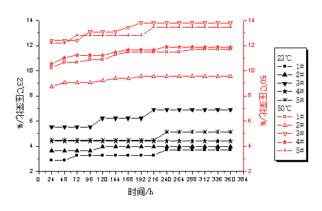 圖3為5種基材試樣在10 MPa壓強作用下試驗得到的壓深比。可以看出,在10 MPa壓強作用下,選定的熱收縮帶產(chǎn)品受壓后均有不同程度的減薄。其中23 ℃試驗條件下,穩(wěn)定壓深比范圍3.69 %~6.90 %;50 ℃條件下,受頂壓后材料減薄幅度明顯增大,所有材料的壓深比均達到9.00 %以上,最高接近14.00 %,但各種材料的壓深比最終趨于穩(wěn)定在各自的定值附近,不再隨時間變化。