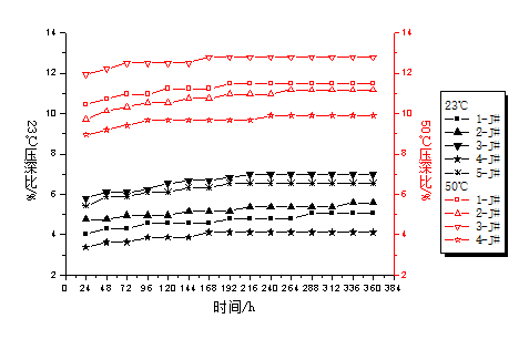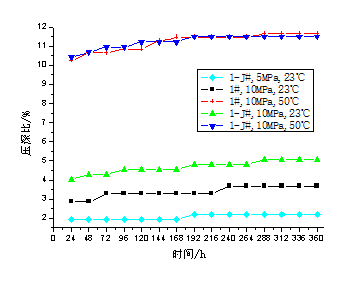 圖7、圖8分別為長圓常溫熱收縮帶試樣(1#、1-J#)在各種試驗條件下壓深比隨時間變化曲線及穩(wěn)定壓深比比較情況。