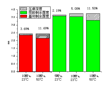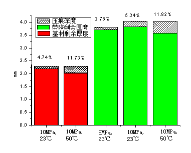 試樣分基材和帶膠2種制備并記錄原始厚度,分別置于不同壓強和溫度下進行壓痕硬度試驗。試驗中,每隔24 h讀取壓痕深度并記錄,直至壓痕深度穩(wěn)定不變。最后,計算每組試樣的壓深比,作為材料的抗壓性能指標進行分析。