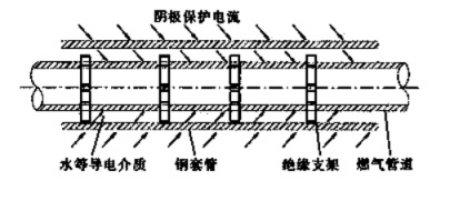 穿越公路、鐵路的3PE燃?xì)夤艿溃凑赵O(shè)計(jì)要求 ,施工時(shí)要加設(shè)套管,并且套管與主管之間要用絕緣的支架支撐,套管兩端用柔性的防水材料封堵,防止地下水進(jìn)入套管內(nèi)使主管道發(fā)生腐蝕。但通過對管道防腐情況的檢測發(fā)現(xiàn),加設(shè)套管并不能阻止管道腐蝕的發(fā)生,而且加設(shè)套管的管段,主管道發(fā)生腐蝕的情況越嚴(yán)重。原因是套管內(nèi)主管道能夠得到有效陰極保護(hù)的必要條件是主管道與套管之間存在導(dǎo)電介質(zhì),而嚴(yán)格按照規(guī)范施工的管道,套管與主管道之間設(shè)絕緣支架,套管兩端防水密封良好,地下水不能進(jìn)入,套管與主管道之間的介質(zhì)是空氣,導(dǎo)致沒有導(dǎo)電介質(zhì)。主管道雖然加設(shè)陰極保護(hù),但陰極保護(hù)電流受空氣層阻斷被完全屏蔽,起不到任何作用,這就是套管對陰極保護(hù)電流產(chǎn)生了屏蔽。另外,在穿越套管施工時(shí),人工拖、拽等操作往往會(huì)破壞主管道的防腐層,如果未及時(shí)發(fā)現(xiàn)并修補(bǔ),管道埋地投用后,因?yàn)樘坠軐﹃帢O保護(hù)電流的屏蔽,陰極保護(hù)不起作用,套管內(nèi)主管道防腐層的破損處會(huì)處于自然氧化、腐蝕的狀態(tài),并逐步蔓延。解決陰極保護(hù)電流屏蔽的方法是: