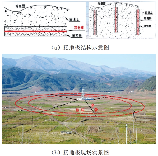 如圖3所示,接地極由電極(饋電棒)、導流系統(tǒng)、輔助設施等構成,型式主要有水平單環(huán)型、水平雙環(huán)型、垂直型和深井型。接地極雖然在工程中有明顯的優(yōu)勢,但也存在地面跨步電壓過大、本體腐蝕、對電力系統(tǒng)交流變壓器偏磁影響和對地下金屬管道腐蝕影響等問題。