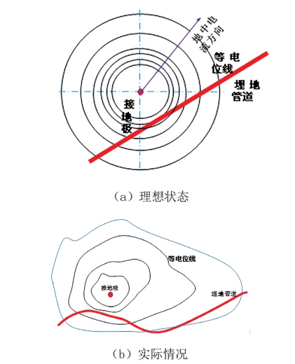 在理想情況下,即在接地極形狀規(guī)則、土壤均勻等條件下,如圖6(a)所示,土壤中的等電位線是以接地極為中心的同心圓,由于管道上電位分布不同,電流在土壤高電位點流入管道,在遠處低電位點流出;而在實際情況下,如圖6(b)所示,管道布局、接地極形狀及埋設方式、環(huán)境變化等參數(shù)的復雜性,使得土壤中地電場分布情況難以求解,因此確定實際情況下管道上電流的流入流出點、計算管中電流以及測定電流密度等都十分困難。