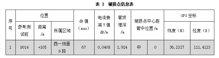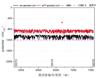 ② 陰極保護(hù)的有效性檢測,對其保護(hù)水平(管道是否獲得全面、合適的陰極保護(hù),是否存在欠保護(hù)及過保護(hù)情況)給予全面評價(jià),對檢測中存在的問題進(jìn)行根源確認(rèn);確定破損處管體的腐蝕/陰保電流的流向,對其腐蝕程度給予評價(jià)。
