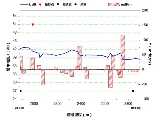 根據(jù)表1所示的評價(jià)準(zhǔn)側(cè), D014樁+105 m外防腐層破損點(diǎn)斷電電位-817 mV,若土壤電阻率偏低則腐蝕的風(fēng)險(xiǎn)會增大,同時(shí)此處ACVGdB值為67,相對加大,可作為有效的直接檢測與評價(jià)點(diǎn),綜合以上因素判定為二類破損點(diǎn)。