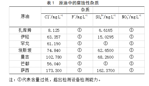 原油中的硫、酸等高分子有機腐蝕性雜質(zhì)在溫度高于220 ℃時才會對金屬材料構(gòu)成腐蝕[3],管輸條件下對管道造成腐蝕的主要是低分子無機腐蝕性雜質(zhì)。對扎庫姆原油、伊朗輕油等原油的腐蝕性雜質(zhì)分析測試(見表1)表明,原油中的腐蝕性雜質(zhì)主要為氯化物、氟化物、硫酸鹽和硝酸鹽。此外,某些原油中還溶解有一定量的硫化氫、二氧化碳等腐蝕性氣體,這些氣體也會溶解到原油析出水中,進一步加劇管道的腐蝕。