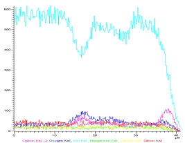 對某站場發(fā)生內(nèi)腐蝕泄漏的管道進行了切割制樣,宏觀觀察發(fā)現(xiàn)為管道底部內(nèi)壁點蝕,掃描電鏡下顯示為垢下腐蝕形貌。EDX分析表明,管道腐蝕坑內(nèi)的垢物主要由碳、鐵、氧、錳、硅、鈣等元素組成,越靠近腐蝕坑底,垢物中的氧含量越高,鐵含量相應(yīng)降低,管道腐蝕產(chǎn)物主要為鐵的氧化物(見圖3)。由此可以看出,原油輸管道內(nèi)腐蝕為有氧環(huán)境中高礦化度水造成的電化學(xué)腐蝕。