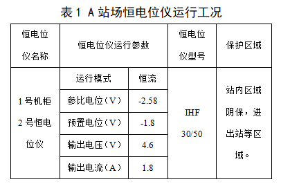 首先對(duì)A站場(chǎng)恒電位儀的運(yùn)行狀況,包括運(yùn)行模式、輸出電流、輸出電壓、參比電位、預(yù)置電位等參數(shù)進(jìn)行了檢測(cè),結(jié)果見(jiàn)表1。