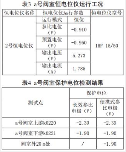 對(duì)a號(hào)閥室恒電位儀的運(yùn)行工況及保護(hù)電位進(jìn)行了檢測(cè),結(jié)果分別見(jiàn)表3、表4。