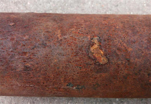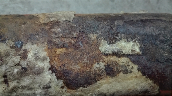 經(jīng)過(guò)對(duì)鋼管內(nèi)外表面及端面的檢測(cè),均未發(fā)現(xiàn)腐蝕坑、壁厚減薄、穿孔等現(xiàn)象,管道仍舊保持原先的表面質(zhì)量和幾何尺寸,未發(fā)生普遍均勻腐蝕現(xiàn)象,可見(jiàn)“環(huán)氧粉末+黃夾克”防腐結(jié)構(gòu)起到了良好保護(hù)效果。但外防腐層脫落部位,鋼管外表面有腐蝕現(xiàn)象發(fā)生,腐蝕層均勻(如圖1所示)。管道內(nèi)壁未發(fā)現(xiàn)腐蝕坑、穿孔等現(xiàn)象,腐蝕產(chǎn)物均勻分布,屬全面腐蝕的類型(如圖2所示)。