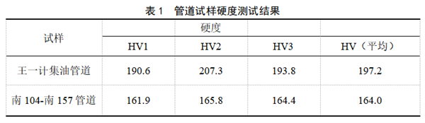 王一計(jì)集油管道試樣的硬度較高,可能是由于金相組織中部分碳化物析出,提高了材料的硬度。