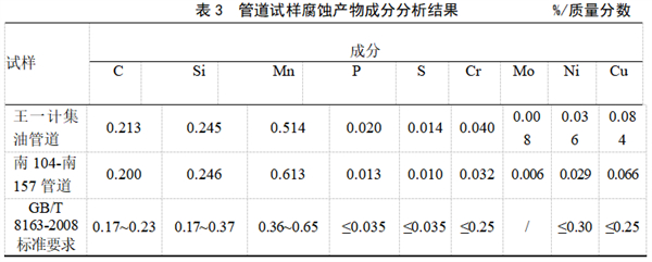 (2)根據(jù)2段管道試樣表面腐蝕產(chǎn)物SEM、EDS和XRD分析結(jié)果,初步得出造成管道失效的主要原因?yàn)檠醺g。