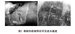 開挖檢測中還發(fā)現(xiàn),有的補口在剝除熱熔膠層時其與PE粘結(jié)呈現(xiàn)不連續(xù)狀態(tài),即熱熔膠與PE層粘結(jié)不緊密,經(jīng)過長期的埋設(shè),地下水沿著熱熔膠與PE界面逐漸滲透至補口管體表面,如果管體無溶劑環(huán)氧底漆厚度較薄,在腐蝕性較強的地區(qū),久而久之會導(dǎo)致底漆剝離和管體的腐蝕。圖2中熱收縮帶熱熔膠與PE局部未粘結(jié)處可見明顯的進水通道。