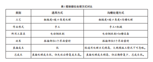 采用溝槽處理方式,與通用搭接部位處理方式的比較見表1: