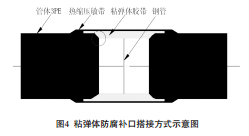 采用粘彈體進行補口修復(fù)時,先對補口部位進行清理和打磨,然后加工出溝槽,粘彈體與管體防腐層搭接寬度不小于50mm。粘彈體防腐補口搭接方式如圖4所示。