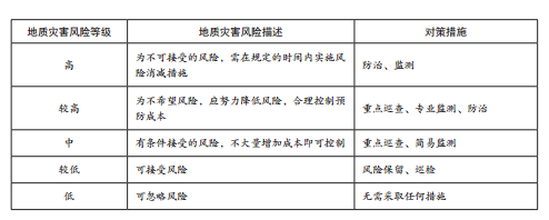 參考中國(guó)石油提出的地質(zhì)災(zāi)害風(fēng)險(xiǎn)分級(jí)原則,在綜合考慮地質(zhì)災(zāi)害危險(xiǎn)性、危害性、工程防治成本等因素情況下,油氣管道地質(zhì)安全評(píng)價(jià)的風(fēng)險(xiǎn)等級(jí)及對(duì)策措施可參考下表進(jìn)行選擇:
